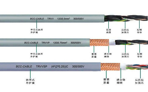 TRVV、TRVVP、TRVVSP電纜都是聚氯乙烯材質(zhì)的,即PVC護套柔性拖鏈電纜,但應(yīng)用場合卻不相同。在電纜所處環(huán)境狀態(tài)良好時,可以選擇TRVV;當(dāng)外界環(huán)境干擾時,可以選擇TRVVP;在外界干擾的環(huán)境進(jìn)行數(shù)據(jù)傳輸時,可以選擇TRVVSP。